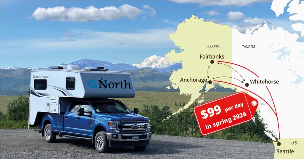 LAST-MINUTE special from GoNorth RV Rental. Pick up in Seattle before June 5, 2026 and return in Anchorage or Fairbanks, AK. Valid for 4×4 Truck Camper Gold, (0-2 years old) for up to 10 rental days, based on availability.