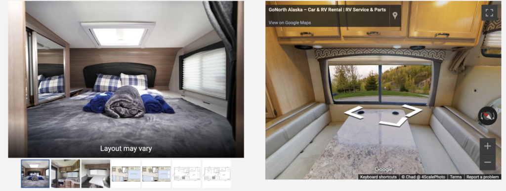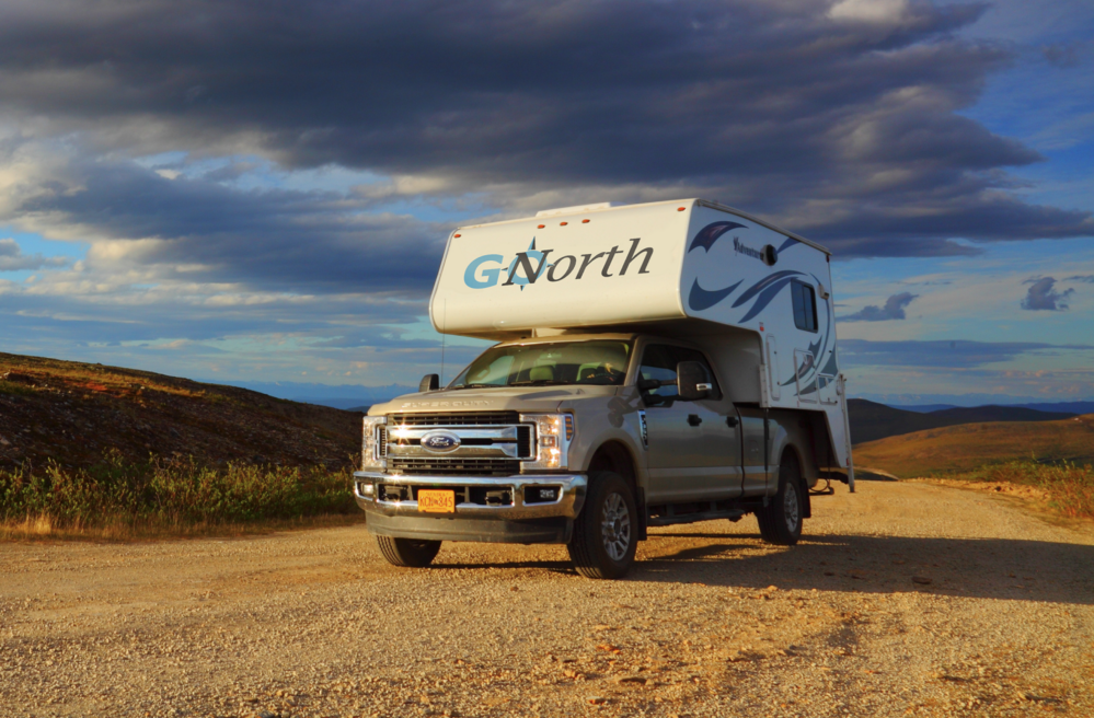 The Truck Camper is the living area (the camper unit) mounted on the loading platform of a 4-wheel drive truck (pictured, above). It’s perfect for driving on gravel and unpaved roads (such as the Alaska Highway, the Cassiar Highway, etc). Gravel roads allowed without surcharge.